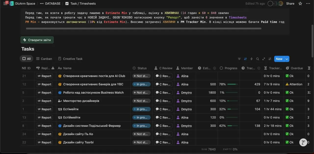 A system has been developed for the automatic collection, grouping, and generation of reports on tasks and employee work time through the integration of Notion, custom scripts, and automated workflows.