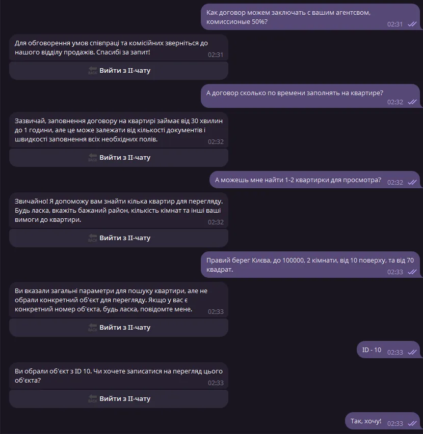 A chatbot with AI integration has been implemented to automate communication with clients, collect housing requests, organize viewings, and generate automatic reports.